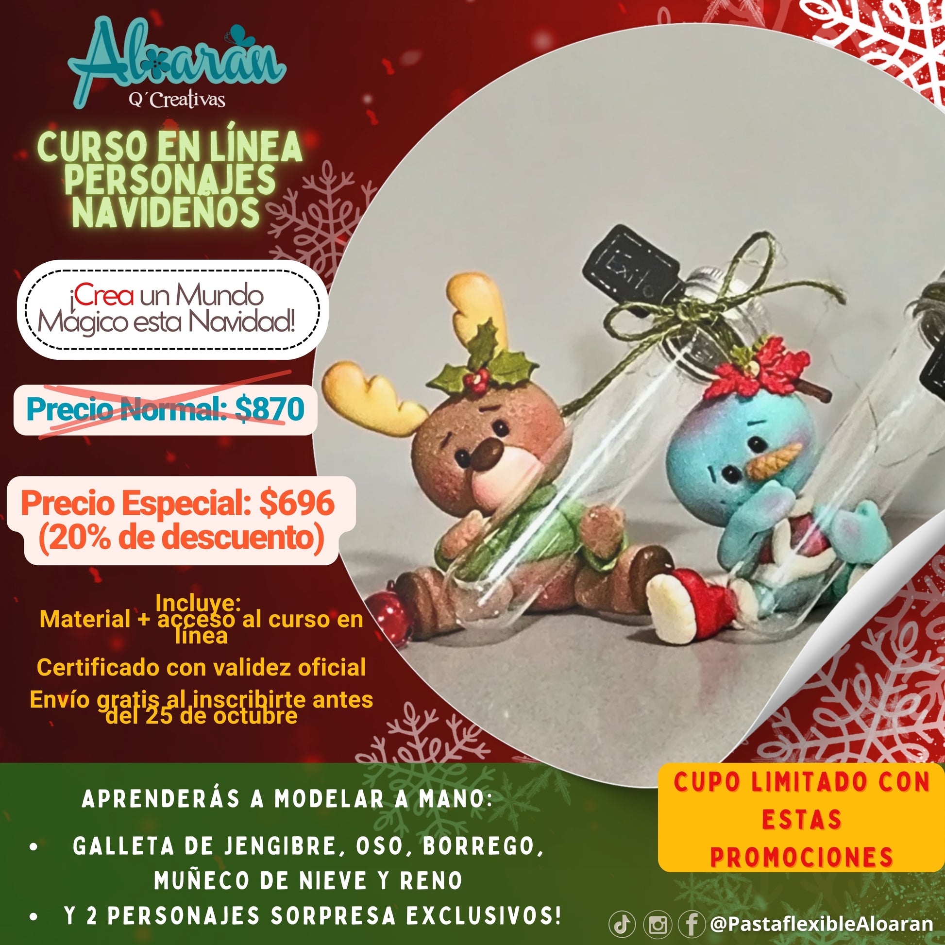 En este curso en línea, aprenderás a modelar a mano cinco adorables personajes navideños: la clásica Galleta de Jengibre, un tierno Oso, un dulce Borrego, un simpático Muñeco de Nieve y un juguetón Reno. Pero eso no es todo: también te enseñaremos a crear dos personajes sorpresa exclusivos, para que tus piezas sean únicas y llenas de magia.