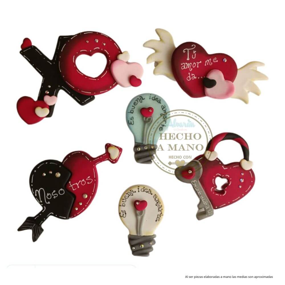 Incluye: 1 cortador de corazón, 1 cortador de ala, 1 cortador de letra X, 1 cortador de letra O (2 piezas), cortador de llave 11 cortador de foco (2 piezas), 1 cortador de corazón con flecha (2 piezas), cortador de ojo de cerradura, 2 cortadores de corazones chicos decorativos. Medidas aproximadas de las piezas: 6cm de alto..